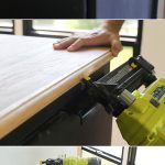 I had my braces in place and my plywood cut so it was time to attach it. I placed my plywood back on top of the cabinets then grabbed my Ryobi Airstrike, 3/4″ Brad Nails and my Ryobi Drill and screws.