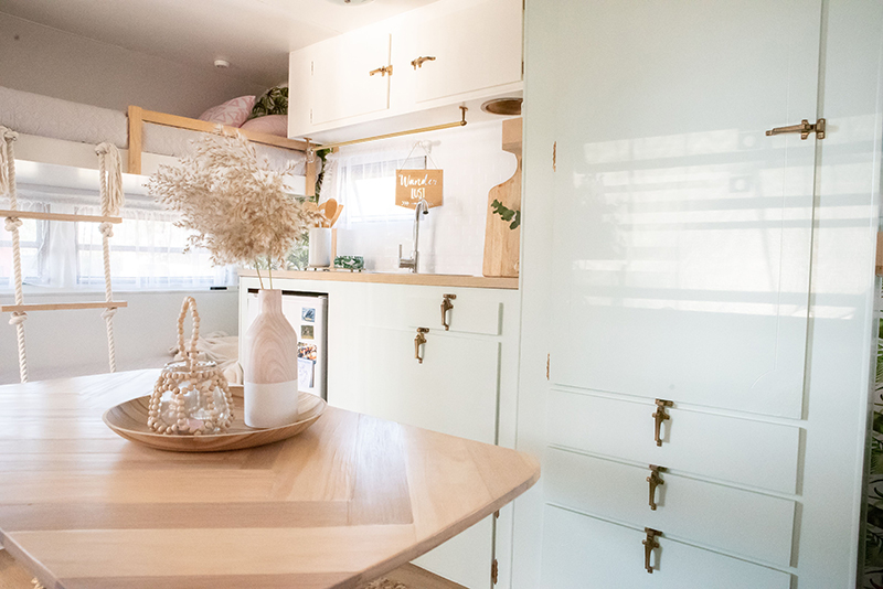 I wanted a fresh, calm feel. From all the research and pinning I had done, I was initially inspired by Michael and Carlene Duffy’s very first caravan renovation on Vonnie the Viscount back in November 2017. I also felt it was important to preserve any unique features of the van, like its vintage door handles and hinges, cabinetry, and light fittings.